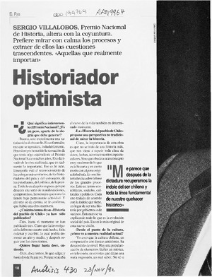 Historiador optimista [artículo] / Felipe Pozo. Análisis. -- no. 430 (nov. 23, 1992) p. 18-21 retr. .
