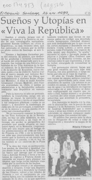 Sueños y utopías en "Viva la República" [artículo] / Mónica Villarroel. El Mercurio (Santiago). -- nov. 26, 1989, p. C15 retr. .