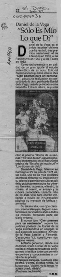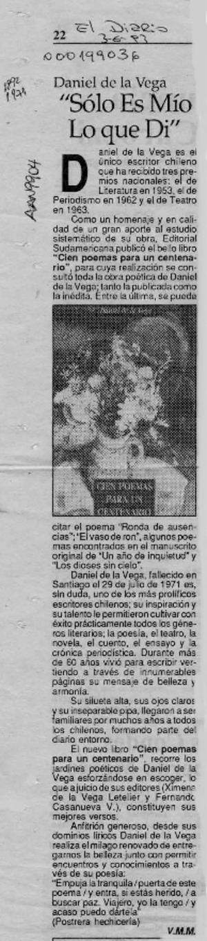 "Sólo es mío lo que di" [artículo] / V. M. M. El Diario. -- jun. 3, 1993, p. 22 il. .