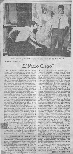 "El Nudo ciego" [artículo] / Sergio Vodanovic. El Mercurio (Diario : Santiago, Chile)-- abr. 7, 1965, p. 5. retr. .