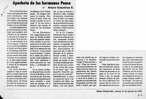 Apacheta de los hermanos Ponce [artículo] / Arturo Volantines R. Chañarcillo. -- ago. 31, 1995, p. 3. .