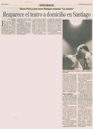 Reaparece el teatro a domicilio en Santiago [artículo] / Yael Zaliasnik. La Epoca. -- mar. 25, 1994, p. 34 .