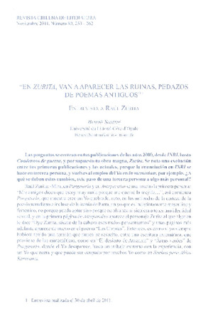 "El Zurita, van a aparecer las ruinas, pedazos de poemas antiguos" (entrevista) [artículo] / Banoit Santini. Revista Chilena de Literatura (Revista: Chile)-- no. 80 (nov. 2011) p. 253-262. .