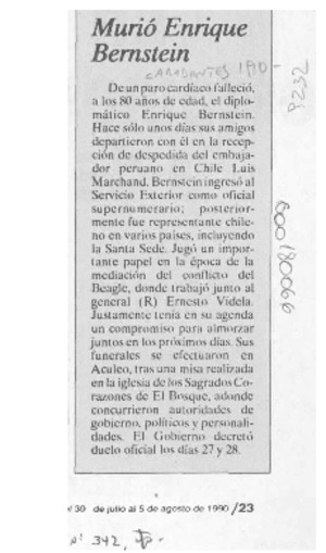 Murió Enrique Bernstein [artículo]. Análisis. -- no. 342 (jul. 30, 1990) p. 23 .