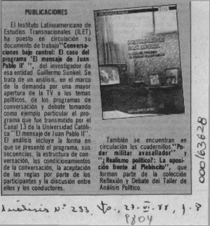 Publicaciones [artículo]. Análisis. -- no. 233 (jun. 27, 1988) p. 8. retr. .