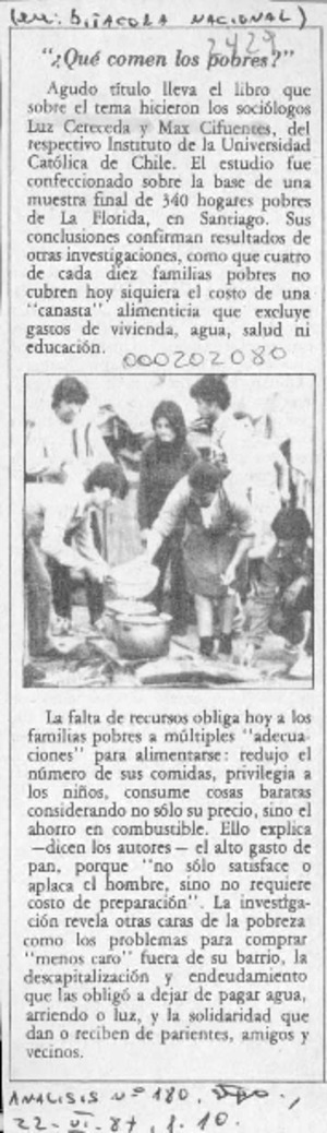 "Qué comen los pobres?" [artículo]. Análisis. -- no. 180 (jun. 22, 1987) p. 10 .