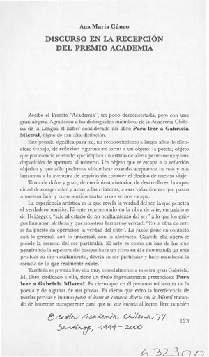 Discurso en la recepción del Premio Academia [artículo] Boletín Academia Chilena (Santiago) no. 74 (1999-2000) p. 123-125 .