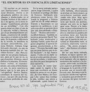 El escritor es en esencia sus limitaciones". [artículo] Bravo (Santiago, Chile)-- no. 50 (sept. 1981) p. 93. .
