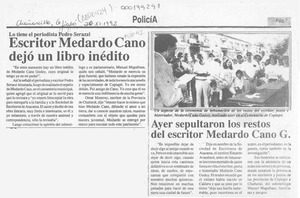 Escritor Medardo Cano dejó un libro inédito [artículo]. Chañarcillo. -- nov. 30, 1992, p. 7. .