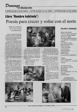 Poesía para crecer y soñar con el norte [artículo] Chañarcillo nov. 1, 1998, p. 6 .