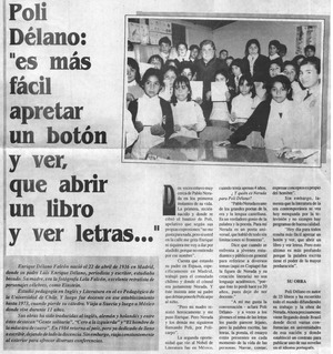 Poli Délano, "es más fácil apretar un botón y ver, que abrir un libro y ver letras --" [artículo]. Chañarcillo. -- jul. 4, 1993, p. 1 (suplemento) retr. .