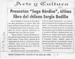 Presentan "Saga Nórdica", último libro del chileno Sergio Badilla [artículo]. Chañarcillo. -- abr. 27, 1996, p. 2. .