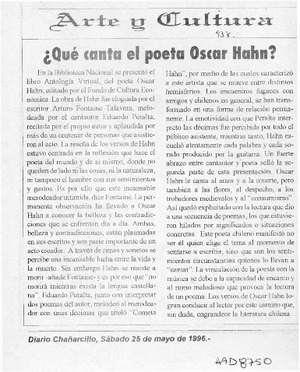 Qué canta el poeta Oscar Hahn? [artículo]. Chañarcillo. -- mayo 25, 1996, p. 2. .