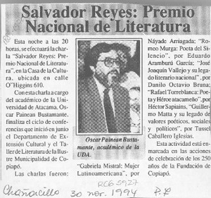 Salvador Reyes, Premio Nacional de Literatura [artículo]. Chañarcillo. -- nov. 30, 1994, p. 7. .