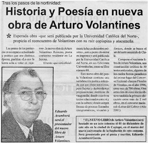 Historia y poesía en nueva obra de Arturo Volantines [artículo] Chañarcillo (Copiapó, Chile)-- oct. 4, 2003, p. 4. retr. .