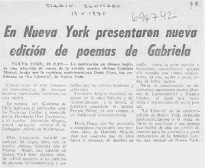En Nueva York presentaron nueva edición de poemas de Gabriela. [artículo] Clarín (Santiago, Chile)-- mayo 19, 1971, p. 8. .