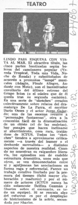 Lindo país esquina con vista al mar [artículo] Cosas (Santiago, Chile)-- no. 85 (ene. 3, 1980) p. 82. retr. .