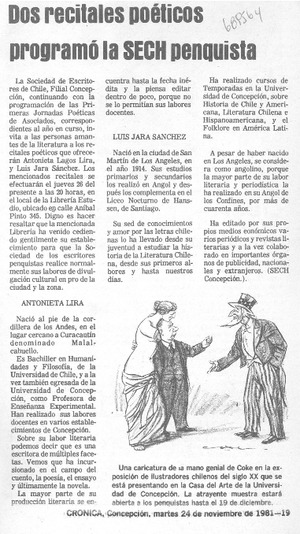Dos recitales poéticos programó la SECH penquista. [artículo] Crónica (Concepción, Chile)-- nov. 24, 1981, p. 19. .