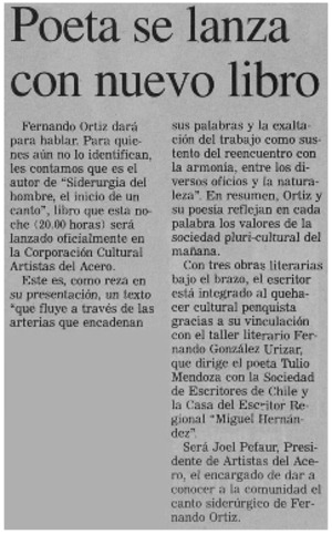 Poeta se lanza con nuevo libro. [artículo] Crónica (Concepción, Chile)-- oct. 3, 2003, p. 8. .