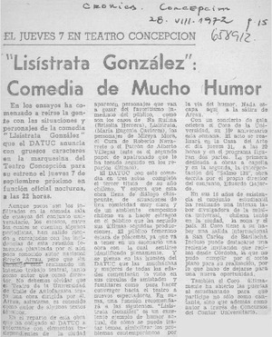 "Lisístrata González", comedia de mucho humor. [artículo] Crónica (Concepción, Chile)-- ago. 28, 1972, p. 15. .