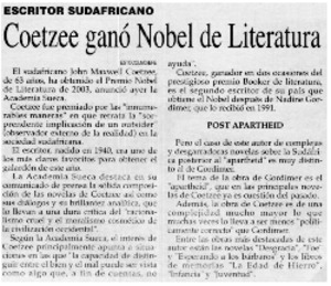Coetzee ganó Nobel de Literatura. [artículo] El Austral (Osorno, Chile)-- oct. 3, 2003, p. 8-9. .
