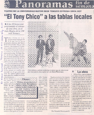 Teatro de la Universidad Mayor sede Temuco estrena obra hoy "El Tony chico" a las tablas locales [artículo] El Austral (Temuco, Chile) oct. 13, 2006, p. A11. .