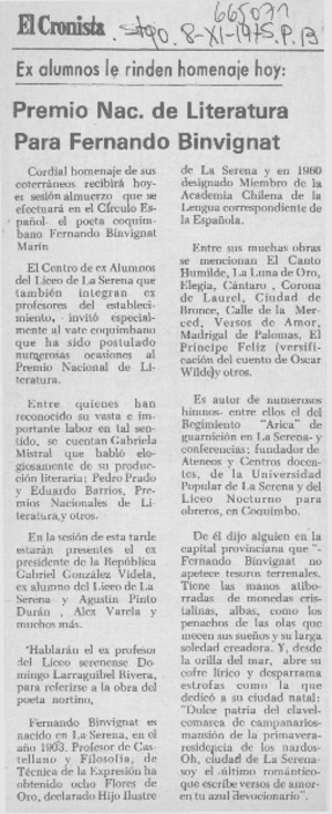 Premio Nac. de Literatura para Fernando Binvignat. [artículo] El Cronista (Santiago, Chile)-- nov. 8, 1975, p. 13. .