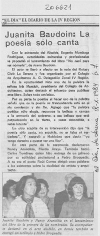Juanita Baudoin, la poesía sólo canta [artículo]. El Día (diario : La Serena, Chile)-- oct. 18, 1984, p. 7. retr. .