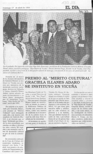 Premio al "Mérito cultural" Graciela Illanes Adaro se instituyó en Vicuña [artículo]. El Día (diario : La Serena, Chile)-- abr. 17, 1994, p. 37 retr. .
