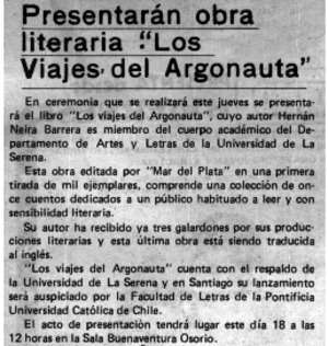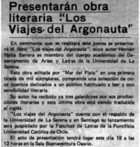 Presentarán obra literaria : "Los viajes del argonauta" [artículo] El Día (diario : La Serena, Chile)-- jul. 17, 1985, p. 11. .