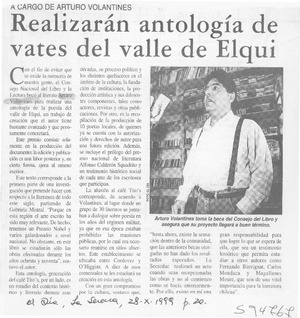 Realizarán antología de vates del valle de Elqui [artículo] El Día (diario : La Serena, Chile)-- oct. 28, 1999, p. 20 retr. .