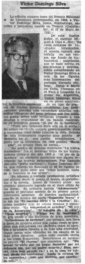 Víctor Domingo Silva. [artículo] El Día (diario : La Serena, Chile)-- abr. 25, 1971. retr. .