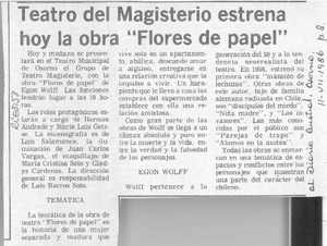 Teatro del magisterio estrena hoy la obra "Flores de papel" [artículo]. El Diario Austral (Osorno). -- jul. 11, 1986, p. 8. .