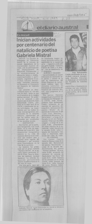 Inician actividades por centenario del natalicio de poetisa Gabriela Mistral [artículo]. El Diario Austral (Puerto Montt). -- abr. 4, 1989, p. 25 retr. .