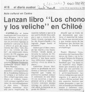 Lanzan libro "Los Chono y los Veliche" en Chiloé [artículo]. El Diario Austral (Puerto Montt). -- sept. 23, 1991, p. A18 .