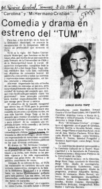 Comedia y drama en estreno del "TUM". [artículo] El Diario Austral (Temuco, Chile)-- jul. 9, 1980, p. 4. retr. .