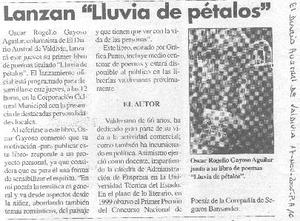 Lanzan "Lluvia de pétalos" [artículo] El Diario Austral (Valdivia, Chile)-- abr. 17, 2005, p. A10 .