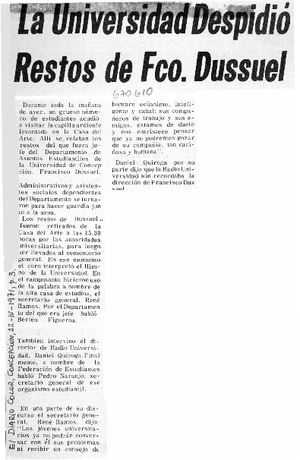 La Universidad despidió restos de Fco. Dussuel [artículo] El Diario Color (Concepción, Chile)-- abr. 22, 1971, p. 3. .