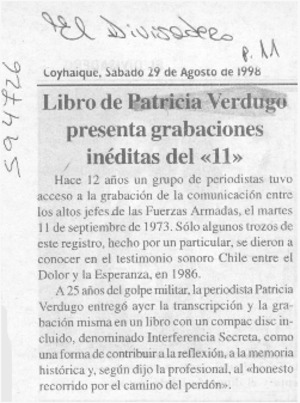 Libro de Patricia Verdugo presenta grabaciones inéditas del "11" [artículo] El Divisadero (Coyhaique) ago. 29, 1998, p. 11 .