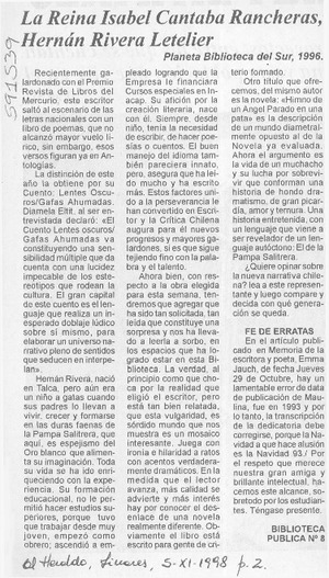 La Reina Isabel cantaba rancheras, Hernán Rivera Letelier [artículo] El Heraldo (Linares) nov. 5, 1998, p. 2 .