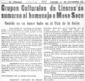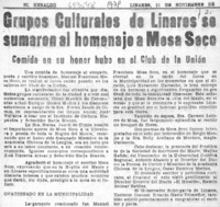 Grupos culturales de Linares se sumaron al homenaje a Mesa Seco. [artículo] El Heraldo (Linares, Chile)-- nov. 21. 1979, p. 2. .