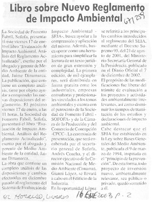 Libro sobre nuevo reglamento de impacto ambiental. [artículo] El Herlado (Linares, Chile)-- ene. 16, 2003, p. 2. .