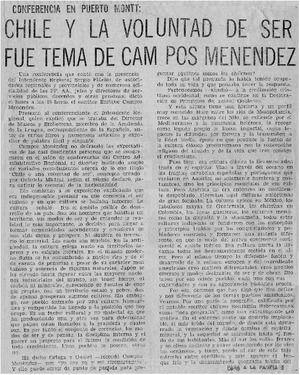 Chile y la voluntad de ser fue tema de cam pos Menéndez. [artículo] El Llanquihue (diario : Puerto Montt, Chile)-- abr. 28, 1982, p. 7-8. .