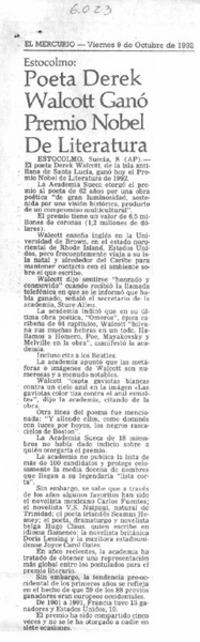 Poeta Derek Walcott ganó Premio Nobel de Literatura. [artículo] El Mercurio-- oct. 9, 1992. .