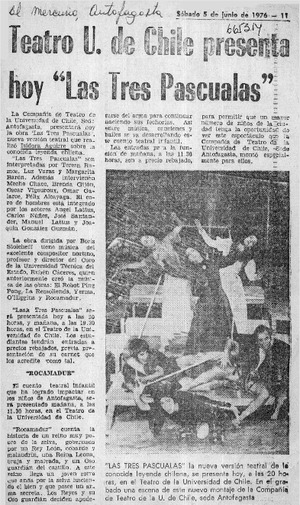 Teatro U. de Chile presenta hoy "Las tres pascualas". [artículo] El Mercurio (Antofagasta, Chile)-- jun. 5, 1976, p. 11. fot. .