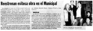 Reestrenan exitosa obra en el Municipal. [artículo] El Mercurio (Diario : Antofagasta, Chile)-- nov. 10, 2003, p. A23. retr. .