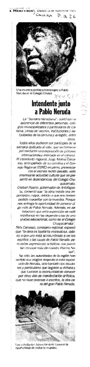 Intendente junto a Pablo Neruda [artículo] El Mercurio (Diario : Calama, Chile)-- ago. 16, 2003, p. A26. retr. .