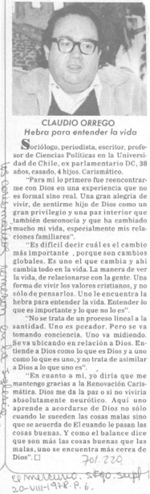 Claudio Orrego, hebra para entender la vida. [artículo] El Mercurio (Diario : Santiago, Chile)-- ago. 20, 1978, p. 6 (suplemento) retr. .