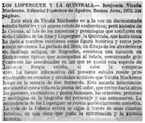 Los Lisperguer y la quintrala. [artículo] El Mercurio (Diario : Santiago, Chile)-- nov. 12, 1972, p. 5. .