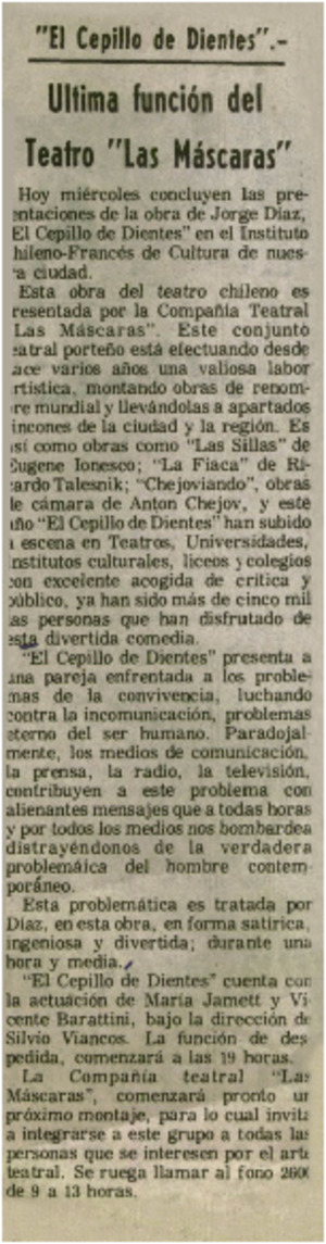 "El Cepillo de Dientes". [artículo] El Mercurio (Diario : Valparaíso, Chile)-- nov. 12, 1980, p. 2. .
